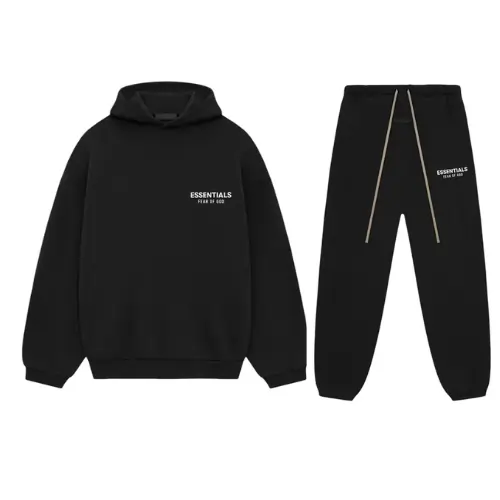 Este conjunto premium está formado por una sudadera con capucha y pantalón deportivo en color negro intenso. Ambas prendas lucen la inscripción «Essentials Fear of God» impresa en blanco, creando un contraste elegante y limpio que define el estilo minimalista de la marca.